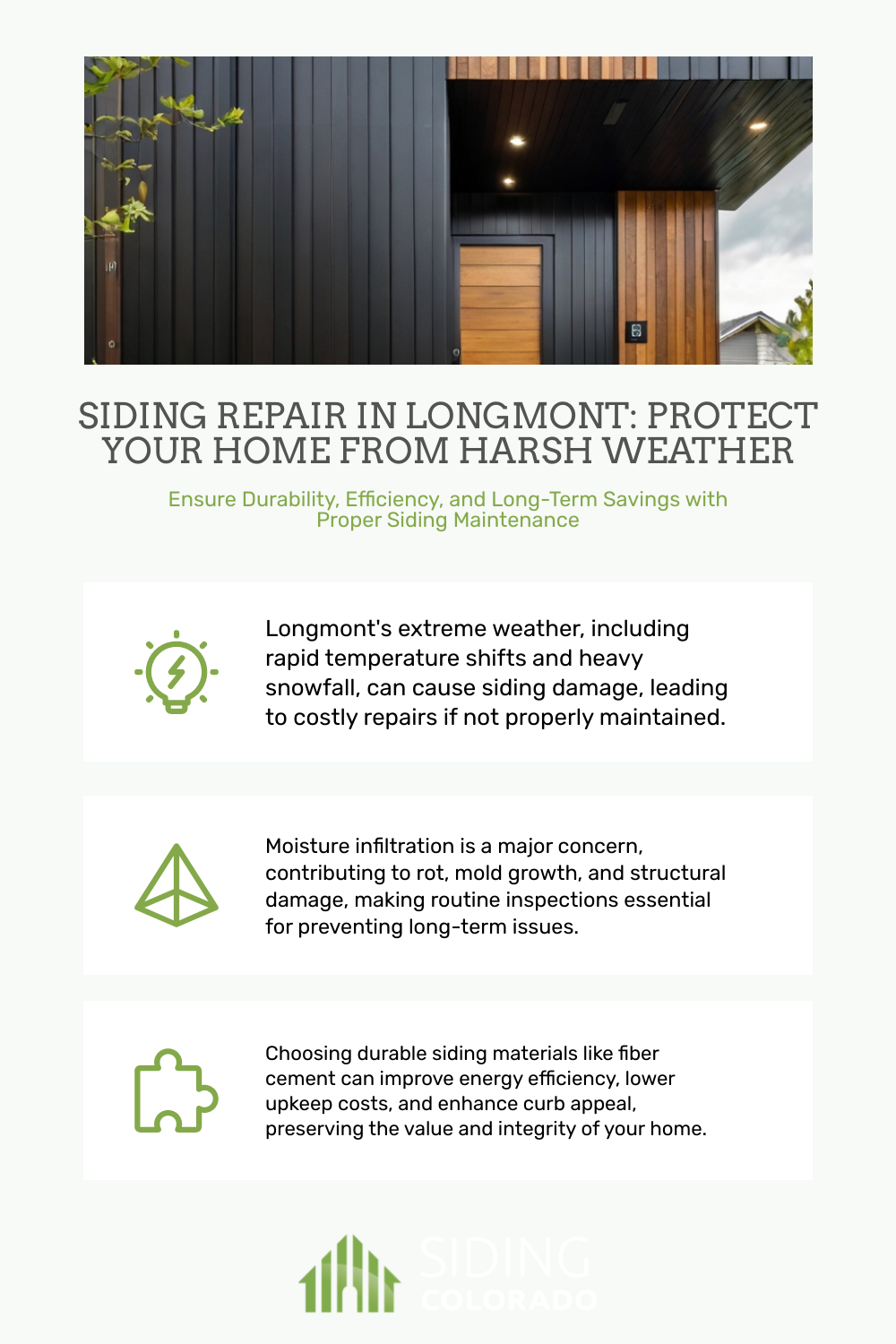 In summary, siding repair is vital to maintaining the beauty and integrity of homes in Longmont’s dynamic climate. By choosing durable materials and conducting regular maintenance, homeowners can protect their investment and enjoy peace of mind. For expert advice and reliable siding repair services, contact Siding Colorado at (720) 452-5510 or contact@sidingcolorado.com. Visit our contact page to learn more and schedule your consultation today!